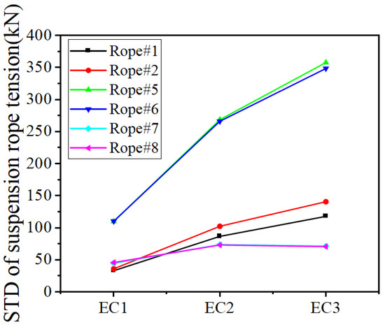 Standard deviations of suspension ropes tension under different ECs.