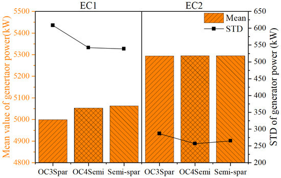 In terms of power generation, Figure 18 compares the mean value and standard deviation of the power generated by the three floating wind turbines under the EC1 and EC2 conditions. It is observed that the semi-spar has a relatively higher average power generation with less fluctuation, which can be attributed to its satisfactory stability. The above comparison shows that the newly proposed floating wind turbine behaves better in power generation and presents superior overall economic benefits.