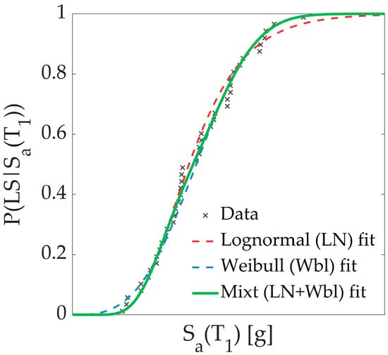 Figure 2 shows the collapse fragility functions of the eight archetypes. It is notable that, at small values of , the lower tails of some PDFs (mostly the Weibull and Cauchy) are well above the data, whereas at large values of the upper tails of other PDFs (mostly the Inverse Weibull and Inverse Gamma) are well below the data.