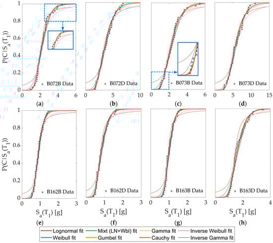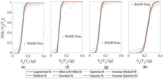 Collapse fragility functions: (a) B072B, (b) B072D, (c) B073B, (d) B073D, (e) B162B, (f) B162D, (g) B163B, (h) B163D. The simulated data presented in each figure (black crosses) were obtained from [,].