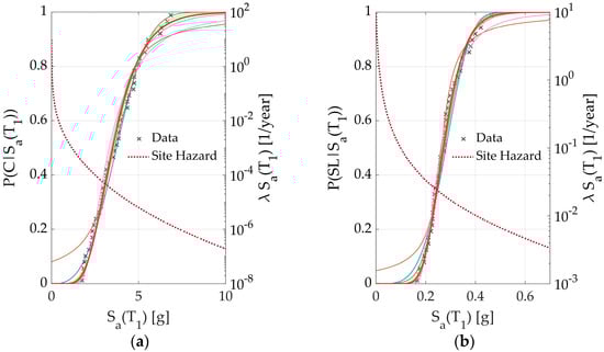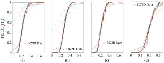 SL fragility functions: (a) B072B, (b) B072D, (c) B073B, (d) B073D, (e) B162B, (f) B162D, (g) B163B, (h) B163D. The simulated data presented in each figure (black crosses) were obtained from [,].