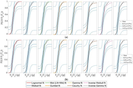Goodness-of-fit tests at (a) 2.5% and (b) 5% significance levels (archetype B072D, collapse fragility).