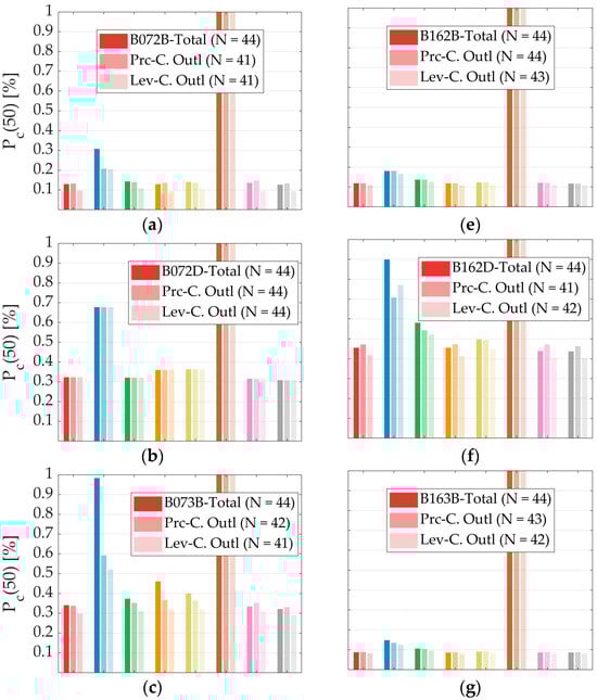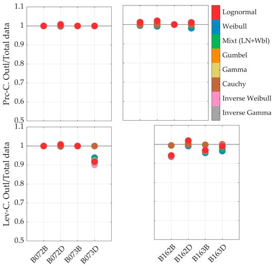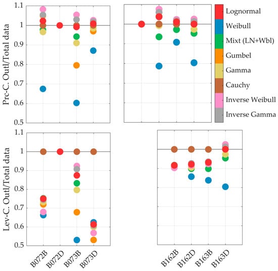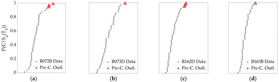 Data outliers or spurious data may be present when fragility functions are derived from data affected by experimental or numerical errors, [] because, in such scenarios, each observation is altered by random and systematic errors []. It is important to remark that data outliers can significantly impact the value of the estimated parameters of the assumed PDF [].