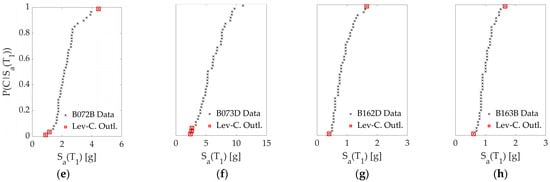 Data outlier identification in collapse fragility functions: (a) B072B, (b) B073D, (c) B162D, and (d) B163B (Peirce’s criterion) and (e) B072B, (f) B073D, (g) B162D, and (h) B163B (leverage criterion).