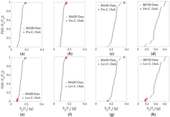 Data outlier identification SL fragility functions: (a) B072B, (b) B073D, (c) B162D, and (d) B163B (Peirce’s criterion) and (e) B072B, (f) B073D, (g) B162D, and (h) B163B (leverage criterion).