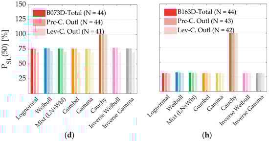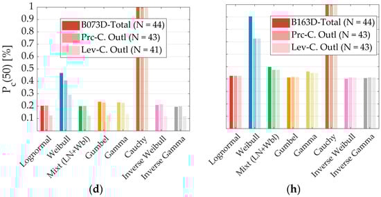 Regarding the innovative mixture PDF proposed in this study, empirical observations suggest that the data may fit better a PDF #1 at a given interval and a different PDF #2 at another interval, where PDF #1 and PDF #2 are identified as marginal PDFs []. This study proposes to assume that the Lognormal PDF fits better at probabilities between 0% and 50% and that the Weibull PDF fits better at probabilities between 50% and 100%. For this purpose, a stochastic approach of weighted distributions is adopted as follows: