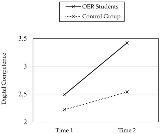 A 2 × 2 repeated measures ANOVA with Time (Time 1/Time 2) and Group (OER students/control group) as factors and digital competence as the dependent variable was conducted with the program IBM SPSS Statistics 27.