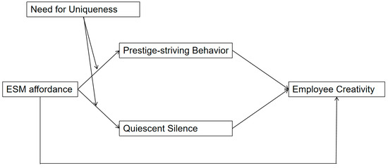 We collected survey data from 428 employees to explore how ESM affordance affects employee creativity. This study used prestige-striving behavior (PSB) and quiescent silence (QS) as mediating variables. Moreover, it used need for uniqueness (NFU) as a moderating variable. The contributions of this study include the following: First, based on the regulatory focus theory and communication visibility theory, this study introduced two variables, namely, PSB and QS, which broadens new ways of understanding ESM affordance from the perspective of a double-edged sword. Second, this study discussed the boundary role of employees’ NFU, which complemented current ESM-relevant research that needs to pay more attention to moderating effects [23]. Third, in terms of practice, this study also provided new ideas for companies to use ESM to enhance employee creativity and thus promote sustainable development.