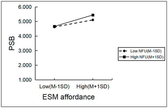 NFU positively moderates the relationship between ESM affordance and PSB, i.e., the higher the NFU, the stronger the positive effect of ESM affordance on PSB.