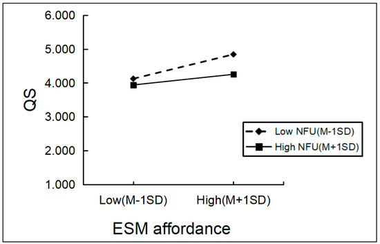 NFU negatively moderates the relationship between ESM affordance and QS, i.e., the higher the NFU, the weaker the positive influence of ESM affordance on QS.
