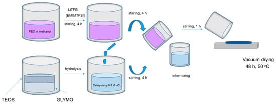 The synthesis of the hybrid electrolyte, incorporating PEO, LiTFSI, EMIMTFSI, and silica, involved harnessing these components’ synergistic effects. Firstly, PEO was stirred to dissolve in methanol, forming a solution that served as the polymer matrix for the solid polymer electrolytes. Simultaneously, LiTFSI was dissolved in an ionic liquid, creating a solution. Then, it was added to the PEO solution. The amalgamation was then stirred thoroughly. At the same time, the silica network, a crucial element of the hybrid electrolyte, underwent preparation using the sol–gel method. Tetraethyl orthosilicate (TEOS) was combined with (3-glycidyloxypropyl)trimethoxysilane (GLYMO) and subjected to hydrolysis with 0.3 M HCl. This process was essential for forming a well-defined silica network within the hybrid electrolyte structure.