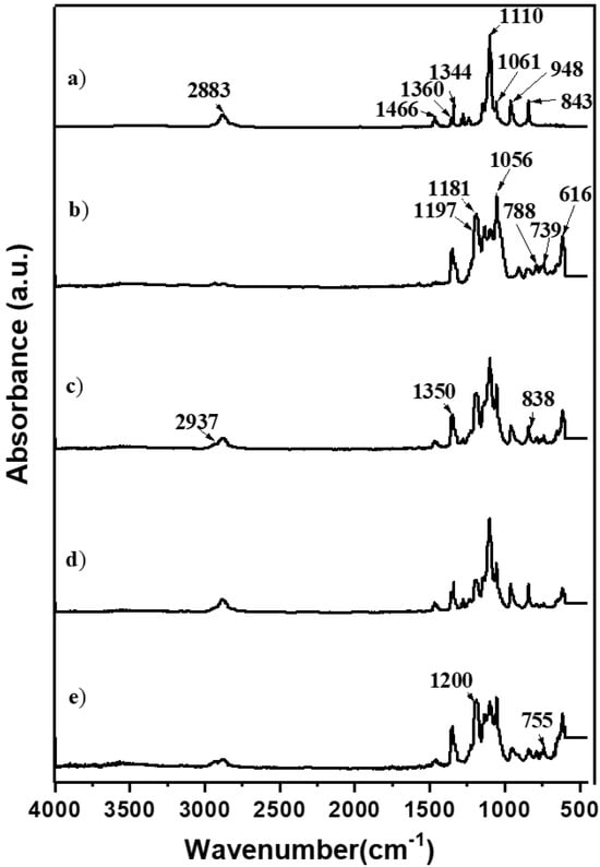 FTIR spectra (4000–450 cm−1) of pure PEO (a) and hybrid polymer electrolyte HPEf0 (b) and hybrid polymer electrolyte with silica network: (c) HPEf25, (d) HPEf20, and (e) HPEf15.