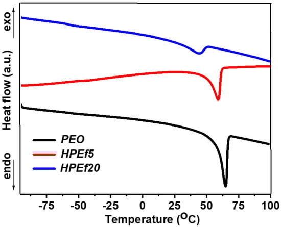 DSC curves of hybrid polymer electrolytes with x wt% of silica network (HPEf): x = 20% (HPEf20), x = 5% (HPEf5) and pure PEO.