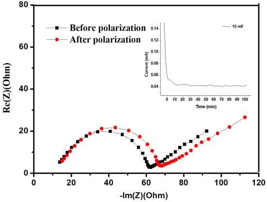 Impedance spectra and the time-dependence response of DC polarization for hybrid polymer electrolyte with silica network (HPEf15) were obtained on the symmetric cell at 70 °C, being polarized with a potential of 10 mV.