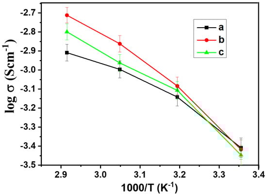 Arrhenius plots of ionic conductivity of hybrid polymer electrolyte, hybrid polymer electrolytes with x wt% of silica network (HPEf): (a) x = 20% (HPEf20), (b) x = 15% (HPEf15), (c) x = 10% (HPEf10). The temperature range was from 25 to 70 °C.