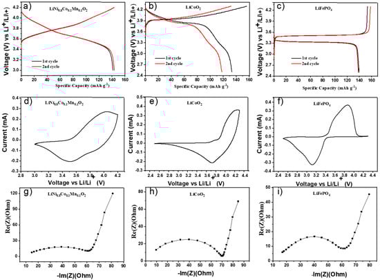 Electrochemical properties of hybrid polymer electrolytes with silica network in half-cells; initial CD profiles at 0.1C, CV curves at 0.1 mV/s, and EIS plots at 55 °C of LiNi0.8Co0.1Mn0.1O2/HPEf15/Li (a,d,g), LiCoO2/HPEf15/Li (b,e,h), and LiFePO4/HPEf15/Li (c,f,i) cells.