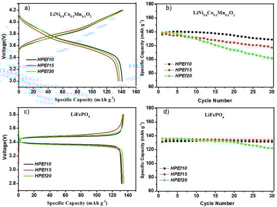 Initial CD profiles and CD performance of hybrid polymer electrolytes with silica network in half-cells at 0.1C at 55 °C: LiNi0.8Mn0.1O0.1/HPEfx/Li (a,b) and LiFePO4/HPEfx/Li cells (c,d).