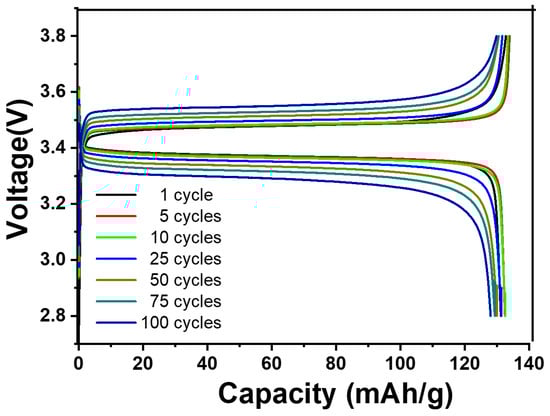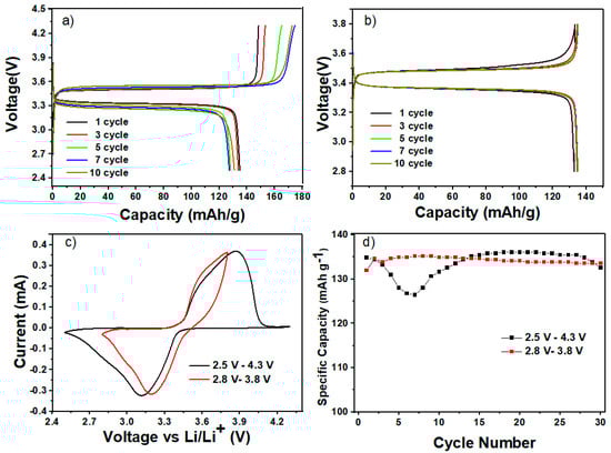 Galvanostatic charge/discharge tests in half-cell configuration were carried out with LFP, LCO, and NMC(811) as cathode materials, lithium metal as the anode, and hybrid polymer electrolyte HPEf as the electrolyte and separator. The electrochemical stability was studied by cyclic voltammetry. Figure 6 shows voltammograms obtained by CV studies at 55 °C of the prepared hybrid electrolyte. As shown in Figure 7c, the cell exhibited a potential plateau of 3.33 and 3.49 V, representing the discharge/charge potential plateau of LiFePO4 at 0.1 C, respectively. The initial discharge capacity was 139 mAh g−1, which is 81.8% of the theoretical capacity (170 mAh g−1). The potential window for nmc811 was chosen for safety reasons [25] to prevent dissolution, and the observed initial discharge capacity was 143 mAh g−1.