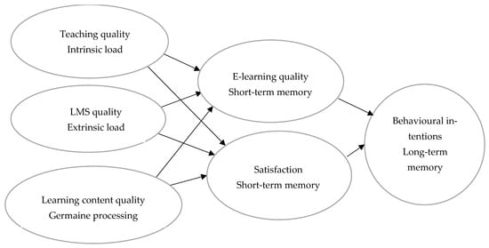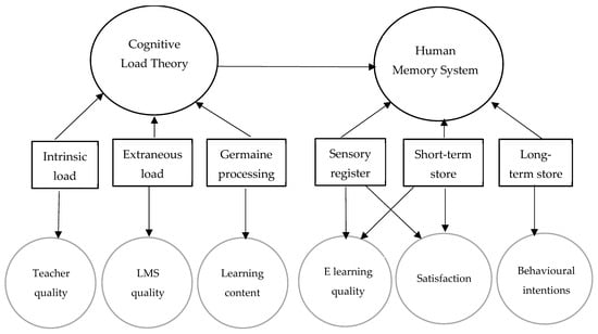 Figure 2 shows the conceptual framework in which the tested data fit the hypothesized model (Theresiawati et al., 2020) [46]. Three exogenous constructs exist: teacher quality, LMS quality, and learning content quality. The exogenous constructs represent the CLT. The theoretical framework noted that these three constructs influence e-learning quality and learner satisfaction. E-learning quality is whether it meets learners’ objective expectations. Satisfaction refers to learners’ feelings arising from comparing their perceptions with expectations and measuring subjective expectations. This study argues that these learning efficiencies, by improving cognitive load, can lead to improved working memory. However, the ultimate learning efficiency occurs in the e-learning quality, and student satisfaction contributes to building students’ long-term learning memory by developing learning schemas (patterns). The study argued that such long-term learning efficiencies lead to behavioral intentions encouraging students to continue using online learning (Theresiawati et al., 2020) [46].