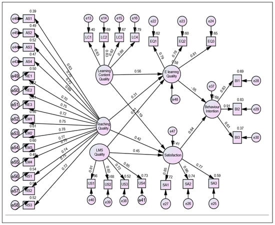 E-learning quality is about the availability of instructions to use e-learning aspects that are continually updated and are clear and adequately described. Satisfaction refers to student satisfaction with the decision to use an e-learning system and environment. Behavioral intention describes the intention of users to continue using online learning (Udo et al., 2011; Uppal et al., 2018) [47,48].