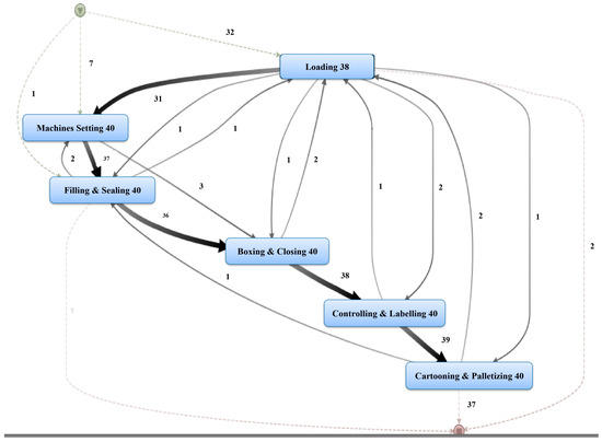 - Extraction of the current business process: The “Disco” program generated a model based on a 20-day sample. Each day contained batches, with 40 cases (batches) in total. Each case had around six activities, resulting in a total of 238 “Events”. Figure 4 illustrates all the business process activities in the manufacturing unit.