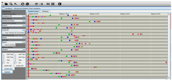 To validate the order and consistency of the activities, the “ProM 6.12” software was utilized to create a “Dotted chart”, which is a popular tool in PM. This chart provides a clear comprehension of the sequence of activities in the study’s event log, where each point denotes a different activity and the lines indicate cases. Figure 5 demonstrates the sequence of activities.