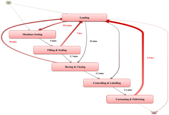 The discrepancy in the time taken in the production process compared to the amount of production achieved is very clear, and it is important to explain the causes that led to the differences in the quantities produced. Figure 6 shows an analysis of the workflow for the few cases in which bottlenecks were found, indicating the waiting time spent (average waiting time) between activities. The most time spent between activities is indicated by the prominent arrows in red in an attempt to focus on, reduce, and optimize this wasted time.