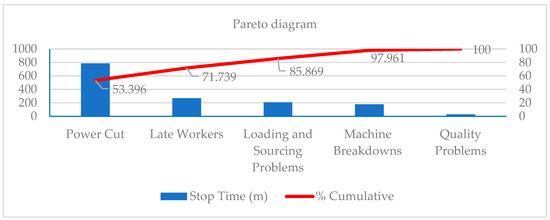 In Figure 7, the frequency of each cause is displayed. The chart works on the principle of Pareto, which involves identifying the 20% of causes that are responsible for 80% of the problems. However, using this chart to determine the proportion of each problem based on frequency alone may not always be accurate. This is because it assumes that the effect of each cause is constant and, therefore, the repetition of causes has the same effect. To accurately determine the extent of the effect of the causes illustrated in the figure, it is better to use the weighting of causes method, where the duration of the stoppage is calculated for each cause. Table 5 provides information on the bottleneck cases.