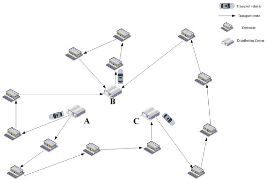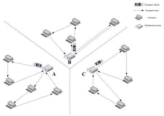 Figure 1. Independent distribution model. A, B, and C represent three logistics companies that carry out logistics and transportation activities in this area. - (2)