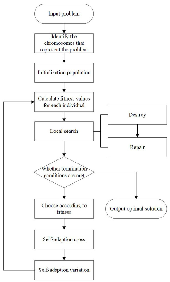 Adding the self-adaptive cross-mutation probability and the damage repair mechanism of the large-scale neighborhood search algorithm on the basis of the original genetic algorithm, the algorithm flow chart of the improved genetic algorithm constructed in this paper is shown in Figure 3 as follows: