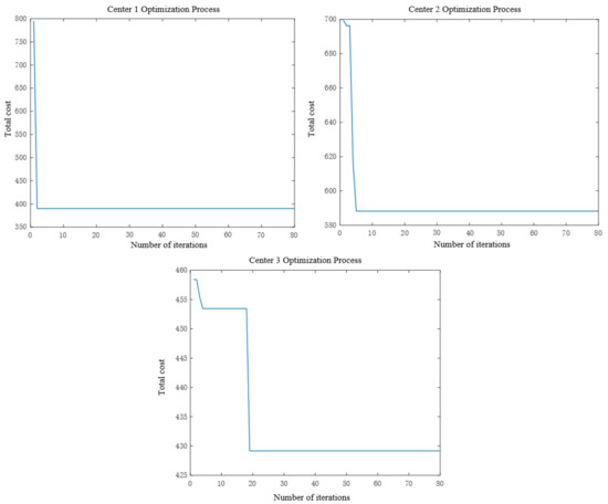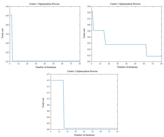 As can be seen in Table 10, under the joint distribution model for the pick-up and delivering vehicle routing problem model, the three distribution centers were jointly distributed using a total of nine vehicles, for which the starting distribution center and the ending distribution center on six paths were different. The vehicles drove a total of 464.02 km, resulting in a time penalty cost of 523.48 CNY and a carbon emissions cost of 754.53 CNY, with a total cost of 2925.08 CNY after completing all pick-up and delivery tasks.