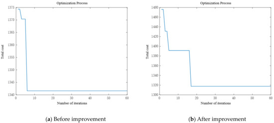 MATLAB R2021b was used to implement the improved genetic algorithm to solve the case of the simultaneous pick-up and delivery vehicle routing problem model under the two modes. The results of the two models were compared and analyzed, and the results are shown in Table 11 and Figure 9.