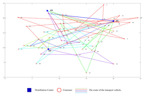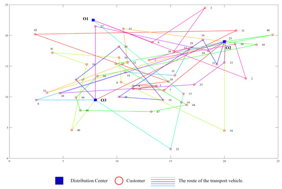 Next, the resources of the three distribution centers were integrated together, and the improved genetic algorithm was used to solve the model of the simultaneous pick-up and delivery vehicle routing problem under the joint distribution model. The optimal distribution roadmap is shown in Figure 8. The same as above, in the figure, lines of different colors represent the transportation paths of different transportation vehicles, blue squares represent distribution centers, and circles represent customer points. The solution results are shown in Table 10.