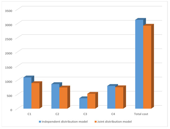 Analysis of the data in Table 11 and Figure 9 shows that the total cost under the joint distribution model is lower. For one transportation scenario, the joint distribution model is reduced by 207.11 yuan compared with the independent distribution model. It can be found that the joint distribution model can save the enterprise about 6.61% of the total cost. A detailed analysis of each cost can obtain the following conclusions: