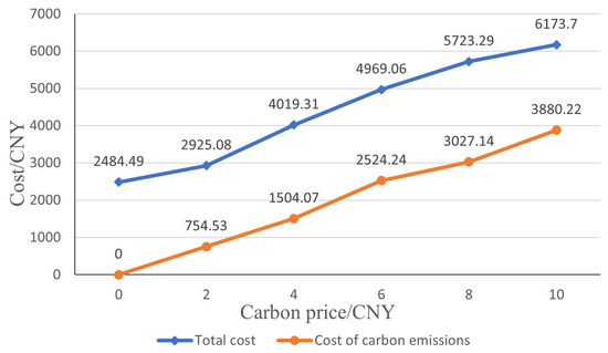 With the passage of time, the carbon price is not static, and an increase or decrease in the carbon price can be expected. In this section, in the context of the joint distribution model, the impact of different carbon prices on the distribution cost of enterprises is discussed. First, a fixed carbon quota of 50 kg was set and the carbon price was set to 0, 2, 4, 6, 8, and 10 CNY/kg. Then, the cost results were obtained for each carbon price many times and the lowest value was selected. The change trend of the total distribution cost under different carbon prices is shown in Figure 10.
