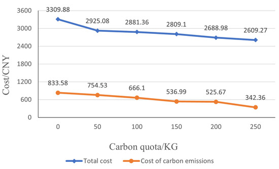 Different carbon quotas have a certain impact on the carbon emissions cost of an enterprise. A larger carbon quota means that the enterprise can emit more carbon emissions. Therefore, the impact of different carbon quotas on the distribution cost of the enterprise was explored in the context of a joint distribution model. The carbon price was set to 2 CNY/kg, and the carbon quota was set to 0, 50, 100, 150, 200, or 250 kg. The change trend of the total distribution cost was then solved under the different carbon quotas. The results are shown in Figure 11.