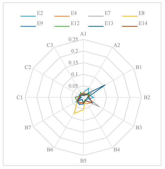 - Obtain the optimal and worst solutions of each risk assessment index. The optimal solution for the risk assessment index is , and the worst solution is .