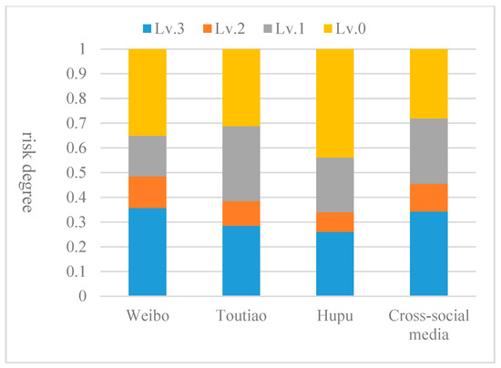 By comparing the risk interval results in Figure 6 horizontally, it can be seen that the risk level intervals were divided differently in different contexts. The results of risk assessment and warning in the context of single social media cannot represent the development situation in a cross social media context. The analysis results of Weibo show that the Lv.1 risk public opinion was easy to exaggerate, and the Lv.2 risk public opinion was easy to ignore, which was not conducive to the judgement and management of medium-risk enterprise public opinion by public opinion managers. The analyses of Toutiao and Hupu show that the Lv.3 risk, Lv.2 risk, and Lv.1 risk cases of enterprise public opinion were easy to exaggerate, resulting in a waste of public relations resources.