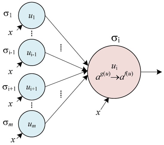 A directed network consisting of m neurons makes up an NSNP system, where neurons serve as nodes, and edges indicate synaptic connections between neurons. Figure 2 shows an NSNP system, where represent the m spiking neurons. An external input x, a state unit , and a nonlinear rule are contained in each neuron, where and are two identical or different nonlinear functions.