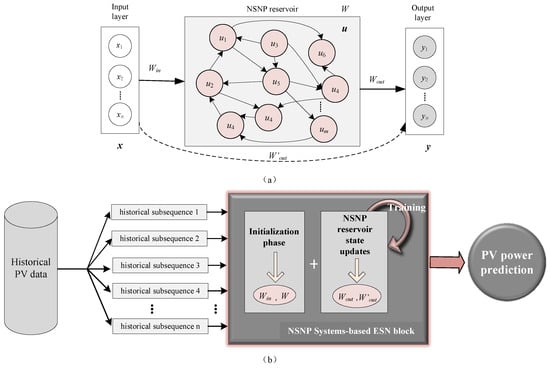 The model which we suggest in this paper is an entirely novel recurrent-like model. Figure 3a shows the structure of the NSNP-system-based ESN block. This block is an NSNP system that has input and output (readout) layers at the front and back of this system, respectively. The NSNP-system-based ESN block uses an NSNP system as the reservoir, in contrast to the existing ESN and its variants. In other words, the NSNP system provides the dynamics for the proposed model. The proposed prediction model is shown in Figure 3b; in this model, PV data consisting of each weather variable and historical power generation data are used as input to the NSNP-system-based ESN block, and then the system-based ESN block is trained to determine and , and finally PV power prediction can be performed.