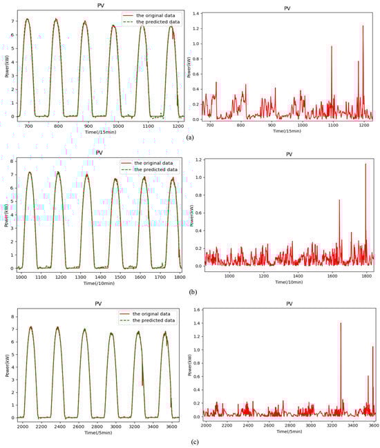 From Figure 4a–c, we can see the prediction results of the proposed model on the test set at 15 min, 10 min, and 5 min resolutions, respectively, where the original and prediction curves of every group of PV power on the test set are plotted on the left, while their absolute error curves are plotted on the right. From these figures, we can observe that the predicted curves almost coincide with the original curves at the three resolutions. This suggests that the proposed model can capture the fluctuations in the PV data well. Also, we see lower absolute prediction errors at the three resolutions.