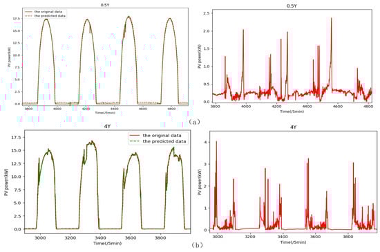 Figure 5a,b present the prediction performance of the proposed model at 0.5 Y and 4 Y, respectively, where the original and predicted curves for every group of PV power are plotted on the left, and their absolute error curves are plotted on the right. The outcomes show that the proposed model is highly capable of capturing the variations in the PV data series, and has a small absolute error of prediction.