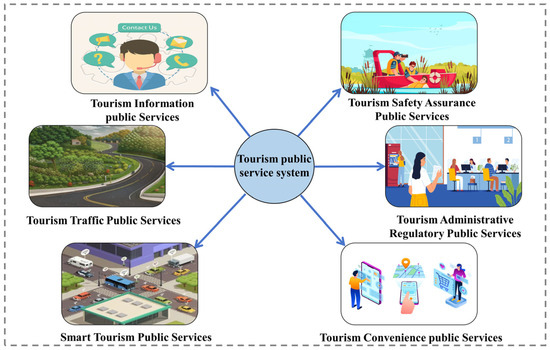 The World Tourism Organization defines “tourism services” as “all services provided by institutions or enterprises in the tourism industry to meet tourists’ needs” [13]. Scholars consider tourism services as a business activity realized through managing various forms of facilities, equipment, methods, means, channels, and service personnel [14]. Differing from tourism services, public services are non-profit services provided to most citizens. Due to significant market failures, the government is justified in engaging in production, financing, or regulatory activities [15]. As one of the components of public service provision, tourism public services are a system formed based on government functions to meet tourist needs [16]. Among the many definitions of tourism public services, the government-led supply characteristic has been repeatedly mentioned by scholars [17,18] as it helps to target the organizations and individuals involved in tourism activities, as well as aids in understanding how to satisfy group demands for non-profit products and services [19]. In addition, it is characterized by being fundamental, public welfare-oriented, and platform-based [20]. The academic community offers diverse definitions of tourism public services; however, although it is based on previous research, this paper believes that tourism public services are primarily fundamental and public welfare services that are led by the government and provided jointly with other social organizations are aimed at satisfying the core travel needs of tourists.