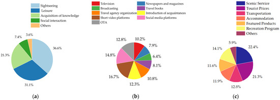 Based on the first part of the 1122 valid questionnaires, a descriptive analysis of the tourist demographic information was conducted (Table 1). The survey interviewed 593 male tourists (52.9%) and 529 female tourists (47.1%). The age of the respondents was primarily concentrated among young and middle-aged adults, i.e., those aged 25–44 years, accounting for 497 respondents (44.3%). The educational level of the tourists mainly centered around bachelor’s or associate degrees, totaling 701 respondents (62.5%). The interviewees included 275 corporate employees (24.5%), followed by students, self-employed individuals, and professionals (e.g., teachers and doctors). The monthly income level of the tourists predominantly ranged between CNY 4000 to 6999, with 431 respondents (38.4%) and 242 respondents (21.6%) earning less than CNY 3000 per month, which was likely due to a substantial proportion of students with limited living expenses among the interviewees (this article was processed on 12 September, when the exchange rate of CNY to USD was 1:7.1986). The purpose of travel (a), information source channels (b), and content of interest (c) are presented in the following charts (Figure 3).