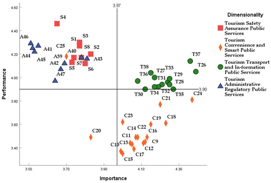 Based on the calculated average values of importance and satisfaction, this study employed IPA analysis to construct a four-quadrant matrix of the average importance and satisfaction values of each indicator. The specific importance and satisfaction values of each indicator were plotted within the quadrant matrix for interpretation and analysis. The matrix, as illustrated in Figure 4, was constructed with the average values of all importance and satisfaction (3.97, 3.9) as the origin, which was achieved using horizontal coordinates for importance and vertical coordinates for satisfaction. Labels S1 to S8 represent the indicators of the Tourism Safety Assurance Public Service; labels C9 to C25 represent the indicators of the Tourism Convenience and Smart Public Services; labels T1 to T13 represent the indicators of the Tourism Transport and Information Public Services; and labels A1 to A9 represent the indicators of the Tourism Administrative Regulatory Public Services.