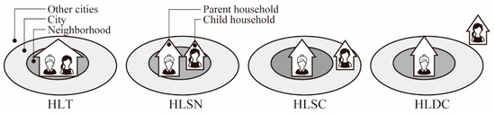 Four types of parent–child residential distance. HLT represents parent–child households living together; HLSN denotes parent–child households living in the same neighborhood; HLSC denotes parent–child households living in the same city; HLDC represents parent–child households living in a different city.