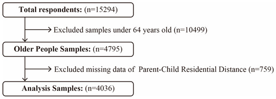 Figure 2 shows the sample flow diagram. As shown in Figure 2, the number of respondents to the 2016 Comprehensive Survey of Living Conditions was 15,294. Of these respondents, this study excluded 10,499 respondents who were aged 64 years old or younger. As a result, the number of older people was 4795. In addition, due to missing data, this study excluded 759 respondents who did not provide an answer regarding parent–child residential distance because they did not have a child, refused to provide a response, or gave unreadable answers. The proportion of missing data in the total sample of older people was approximately 15%, which is appropriate for the paper-based national survey. The final sample size for this study was 4036 older parents. The samples comprised older parents of the HLT (n = 1788), HLSN (n = 396), HLSC (n = 670), and HLDC (n = 1192) groups.