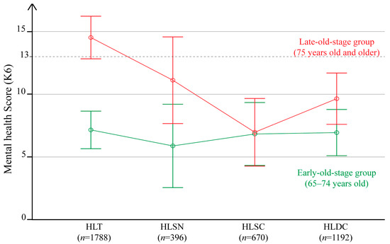 Mental health and parent–child living type. The green line is the mental health score of the early-old-stage group (65–74 years old), and the red line is that of the late-old-stage group (75 years old and older). Error bars indicate a 95% C.I. HLT denotes parent–child households living together; HLSN denotes parent–child households living in the same neighborhood; HLSC represents parent–child households living in the same city; HLDC represents parent–child households living in a different city.