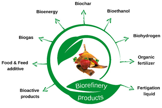 For this reason, the European Landfill Framework Directive (1999/31/EC) and the Waste Framework Directive (2008/98/EC) have obliged EU Member States to minimize the number of biodegradable residues going to landfills. There are ongoing changes to this and other Framework Directives to set more restrictive limits on the landfilling of food waste. Therefore, managing fruit processing byproducts is important for reducing the amount of food waste going to landfills and developing reuse strategies for valorization and economic added value. In an effort to reduce global food waste, fruit processing byproducts have emerged as promising and sustainable feedstocks for bioenergy and biofuels, because they are rich in fermentable sugars and carbohydrates, including cellulose, starch, hemicellulose, and pectin [10]. However, producing bioenergy or biofuels from fruit waste is not economically attractive [11]. Hence, there is a strategy to use integrated biorefineries as a technological way to convert fruit byproducts into various products, including biofuels, bioelectricity, organic fertilizers, and value-added products (Figure 1). This coproduction of bioenergy and bioactive compounds improves access to renewable energy and bioproducts, promotes diversification, and creates jobs. Recently, many reviews have been published on the use of fruit byproducts as alternative sources of nutrients [12,13,14]. The nutritional characteristics of fruit byproducts can be found in repositories such as “Feedipedia” (http://www.feedipedia.org/ accessed on 6 February 2024) and “Feed Tables” (https://www.feedtables.com/ accessed on 6 February 2024).