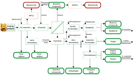 The complete valorization project proposed five main technological phases, pretreatment, extraction, dark or aerobic fermentation, anaerobic digestion, post-treatment, and two other pathways to generate additional bioelectricity: microbial fuel cells and dye-sensitized solar cells (Figure 2). The current section describes the processes and their limitations, as well as the conditions under which fruit byproducts were processed in the literature.